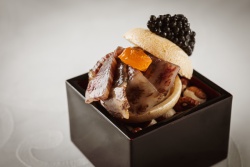 Crisp Wafer Cake filled with Wagyu Beef Tartar, Foie Gras, and Caviar